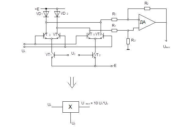 С помощью диодов VD1, VD2 выполняется операция антилогарифмирования, за счет чего достигается расширение диапазонов входных сигналов. С помощью ДУ на ОУ сигнал с VD1, VD2 выделяется, усиливается и преобразуется к однополярному выходу. В результате симметричности схемы обеспечивается 4-х квадрантное умножение и при согласованных транзисторах приемлемая точность умножения (d<1%). Если d<0,1%, то это инструментальные умножители. Каскад без диодов и ОУ выпускается в виде самостоятельного изделия как схема балансного умножителя, смесителя для преобразования (частотного) сигналов. Например: