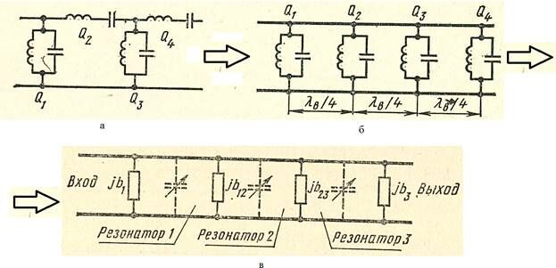 Рис. 4.5 а – прототипный ППФ, б – ППФ с четвертьволновыми связями, в – ППФ с непосредственными связями