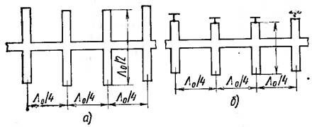 Рис. 4.6. Полосковые шлейфовые ППФ с четвертьволновыми связями: а – с полуволновыми резонаторами, б – с четвертьволновыми резонаторами.