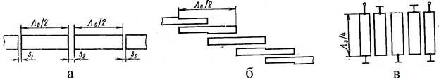 Рис. 4.7 Полосковые шлейфовые ППФ с непосредственными связями: а – на полуволновых резонаторах с торцевой емкостной связью, б – на параллельно связанных полуволновых резонаторах, в – на встречных стержнях (четвертьволновых короткозамкнутых резонаторах)