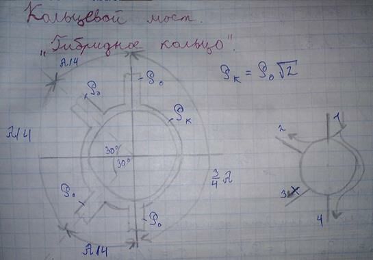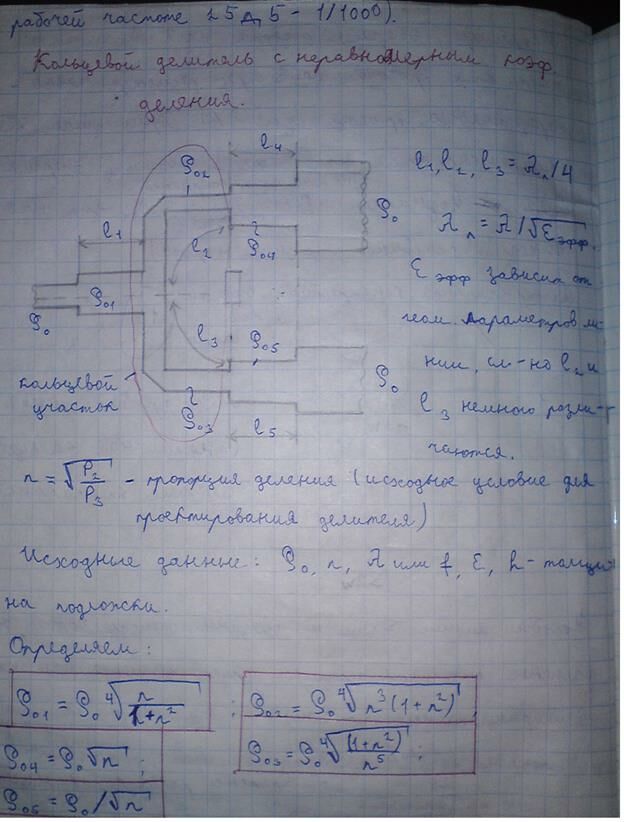 Длина шлейфов и расстояние между ними должны быть равны равны λ/4; 3λ/4; 5λ/4…, где λ – длина волны в полосковом волноводе на средней частоте. Ответвленная в дополнительный канал мощность распространяется в нем в том же направлении, что и в основном полосковом волноводе. При этом фазовый сдвиг напряжений в выходных плечах 2 и 3 ответвителя составляет 90°.