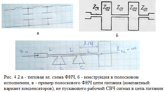 Пример построения ФНЧ (типовая схема показана на рис. 4.2 а) на С и L в виде щироких и узких коротких отрезков полоскового волновода показан на рис. 4.2 б.