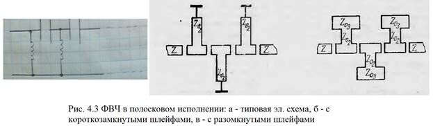 Примеры конструкций полоскового ФВЧ фильтра (типовая эл. схема – рис. 4.3 а) показан на рис. 4.3 б, в. В ней последовательные емкости выполнены разрывами полоски, но также могут быть выполнены любым из способов, показанных на рис. 4.1 а. Параллельные индуктивности могут быть выполнены в виде короткозамкнутого или разомкнутого отрезка ЛП (согласно рис. 4.1 г).