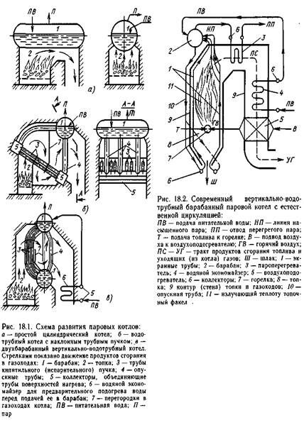 Исходным типом современных котлов был простой цилиндрический котел (рис. 18.1, а), выполненный в виде горизонтального барабана с топкой под ним. Стенки барабана были одновременно и поверхностью нагрева. В дальнейшем увеличение поверхности нагрева шло по двум направлениям. В одном случае непосредственно в водяном пространстве барабана размещались большие и малые трубы; при этом большие одновременно являлись топкой (котлы с жаровыми трубами), а по малым пропускались продукты сгорания (котлы с дымогарными трубами). В другом случае к барабану присоединялись дополнительные наружные трубные поверхности нагрева — кипятильные пучки, заполненные водой и обогреваемые топочными газами (водотрубные котлы).