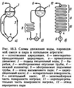Одними из последних являются конструкции прямоточных котлов с принудительным — при помощи питательного насоса — движением воды, пароводяной смеси и перегретого пара. Для этих агрегатов необходимость в барабане отпадает, и он не устанавливается. По прямоточной схеме работают также практически все водогрейные котлы, не имеющие ни испарительных, ни перегревающих поверхностей. Основные схемы движения потока вода — пароводяная смесь — пар в современных котельных агрегатах показаны на рис. 18.3.