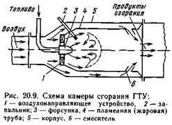 Подготовка рабочей смеси производится в камере сгорания. Огневой объем камеры (рис. 20.9) разделяется на зону горения, где происходит сгорание топлива при температуре порядка 2000 °С, и зону смешения, где к продуктам сгорания подмешивают воздух для снижения их температуры до 750—1090 °С в стационарных турбинах и до 1400 °С — в авиационных турбинах.
