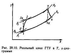 В реальных условиях все процессы в ГТУ являются неравновесными, что связано с потерями работы в турбине и компрессоре, а также с аэродинамическими сопротивлениями в тракте ГТУ. На рис. 20.10 действительный процесс сжатия в компрессоре изображен линией 1—2, а процесс расширения в турбине — линией 3—4. Точками 2а и 4а отмечено состояние рабочего тела соответственно в конце равновесного адиабатного сжатия и расширения, точкой О — параметры окружающей среды. Ввиду потерь давления во всасывающем тракте компрессора (линия 01) процесс сжатия начинается в точке1.