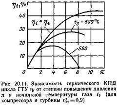 Поэтому наибольшая эффективность реального цикла, в отличие от идеального, достигается при определенной (оптимальной) степени повышения давления, причем каждому значению Тз соответствует свое πопт (рис. 20.11). КПД простейших ГТУ не превышает 14—18 %, и с целью его повышения ГТУ выполняют с несколькими ступенями подвода теплоты и промежуточным охлаждением сжимаемого воздуха, а также с регенеративным подогревом сжатого воздуха отработавшими газами после турбины, приближая тем самым реальный цикл к циклу Карно.