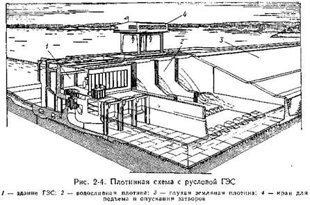 Русловой называется такая ГЭС, у которой здание ГЭС наряду с плотиной входит в состав сооружений, создающий напор (рис 2-4).