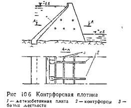 Контрфорсные плотины выпол­няются в виде железобетонных ре­бер (контрфорсов) на которые со стороны верхнего бьефа наклонно укладываются железобетонные пли­ты 1, воспринимающие давление во­ды (рис 10.6). Контрфорсы 2 скрепляются между собой балками жест­кости 3, образуя по фронту отдель­ные пролеты. При соответствующей конструкции гребня с низовой сто­роны контрфорсные плотины могут быть водосливными Высота совре­менных крупных контрфорсных пло­тин превышает 100 м (Зейскал ГЭС--115 м).