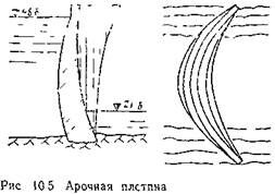 Арочные плотины представляют собой свод, очерченный в плане r виде дуги, упирающейся своими концами в скальные берега, кото­рые и воспринимают основную часть давления воды на плотину со сторо­ны верхнего бьефа (рис 105). Вы­сота таких плотин может достигать более 300 м, однако бетона в ней будет меньше, чем в равноценной по высоте гравитационной. Как разно­видности такие плотины могут быть одноарочными и многоарочпыми, а также арочно-гравитационными. Во всех этих случаях плотины мо­гут содержать специальные водо­сбросы