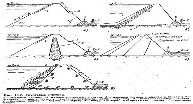 Нередки случаи сооружения зем­ляных плотин из разных по своим водопроницаемым, свойствам грун­тов. В этом случае, чем лучше грунт, тем ближе со стороны верхне­го бьефа он располагается (рис. 10.7,г).