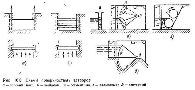 Из поверхностных затворов следует отмстить прежде всего плоские щиты и шандоры. Первые являются основны­ми затворами, вторые используются при ре­монте оборудования и сооружений. Плос­кий затвор помещается в пазах быков или устоев и передвигается в вертикальном направлении (рис 10 8,а). Воспринимаемое им давление воды передается быкам или устоям. Затворы обычно выполняются ме­таллическими. Различают затворы скользя­щие, колесные и катковые. Последние два изготовляются для облегчения подъемных усилий. Предусматриваются специальные уплотняющие устройства для предотвраще­ния фильтрации воды через зазоры между затвором и неподвижными частями соору­жений