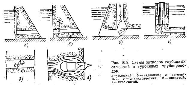 Водосбросные глубинные отверстия плотин перекрываются глубинными затво­рами, которые могут быть плоскими, сег­ментными, цилиндрическими, дисковыми и т. д. Первые два типа аналогичны опи­санным выше (рис. 10.9,а, в).