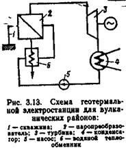 Структурная схема геотермальной электростанции для вулканических районов приведена на рис. 3.13. Схема электростанции для вулканических районов, располагающих ресурсами термальных вод с температурой 100°С на глубинах, доступных для современной буровой техники, приведена на рис. 3.14.