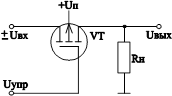 Например, при Uпoр=-5В для входного напряжения -10В, на затвор необходимо подать Uз выкл>-5В+(-10В)=-15В, т.е. -14В, -13В и т.д. Для входного напряжения +10В, на затвор необходимо подать Uз выкл>-5В+ (+10В)=+5В, т.е. +6В, +7В и т.д. Соответственно для переключения знакопеременного сигнала на затвор надо подавать большее из этих расчетных напряжений, например, +10В.