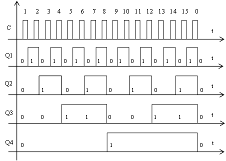 Перед началом счета на входы R всех триггеров кратковременно подается низкий уровень сигнала (R=0) для предварительной очистки счетчика (для установки на всех прямых выходах Q триггеров логического ноля). Как видно из диаграммы счетчик на прямых выходах формирует линейно нарастающие кодовые наборы от 0000 до 1111, являющиеся двоичными эквивалентами десятичных чисел от 0 до 15. Шестнадцатый импульс переводит все триггеры в нулевое состояние. Модуль счета этого счетчика К=24=16.