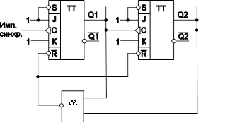 При модуле счета К<2n двоичный счетчик будет иметь избыточные состояния, которые необходимо исключить с помощью дополнительной комбинационной схемы. Например, если требуется создать суммирующий счетчик с К=6, то потребуется не менее 3-х триггеров, т.к. 22<6<23. Счетчик из 3-х триггеров возвращается в исходное состояние после 8-го импульса, а надо после 6-го. Избыточные состояния исключаются с помощью комбинационной схемы И-НЕ, которая после 6-го импульса, когда будет набран двоичный код 110, эквивалентный заданному К=6, подаст сигнал 0 на сбросовые R- входы триггеров и возвратит триггеры в исходное состояние Q1=Q2=Q3=0. Для исключения избыточных состояний входы логического элемента И-НЕ надо соединять только с выходами тех разрядов счетчика, на которых будут единицы при достижении кодового набора, соответствующего требуемому модулю счета К. Пример счетчика-делителя c модулем счета К=3 приведен на нижеследующем рисунке: