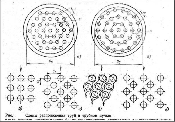 Расстояние между трубами и их число строго регламентировано. Проходное сечение межтрубного пространства превышает проходное сечение труб в 2,5 – 3 раза. Если теплообмен происходит без изменения фазового состояния, то коэффициент теплоотдачи в межтрубном пространстве может быть значительно ниже коэффициента теплоотдачи в трубах. С целью интенсификации теплообмена увеличивают скорость теплоносителей с низшим коэффициентом теплоотдачи. Для чего теплообменники по теплоносителю, движущемуся в