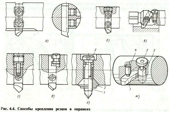 Резец 1 (рис. а) устанавливают в паз оправки, снабженный лысками, на которые заходят заплечики пластины с посадкой Н7/h6. Крепят резец клином 4. Недостатком этой конструкции является быстрое изнашивание оправки по лыскам вследствие нажима на них заплечиков пластинчатого резца. На рис. (б) показано крепление резца 1 с помощью клина 4, прижимающего резец к центрирующему штифту 2. На рис.(в) показан другой вариант этого крепления. Резец 1 имеет полукруглый паз, в который входит центрирующий выступ вкладыша 3. Точное фиксирование и закрепление резца обеспечиваются коническим штифтом 4. На рис. (г) показано крепление гайкой 5 и контргайкой 6. Это крепление надежно, но сложно в изготовлении. На рис.(д) представлено крепление винтом 7 с торца оправки. В конструкции на рис. (е) резец 1 крепят с помощью вкладыша 8, упирающегося в коническую часть винта 9. Винт 10 предохраняет вкладыш от выпадения при вынимании резца. На рис. (ж) представлено плавающее крепление Пластинчатого резца 1 в оправке 11. Этот способ широко применяют при креплении чистовых пластинчатых резцов. Резец устанавливают в пазу с посадкой Н7/h6 по ширине В и длине L, он может самоустанавливаться по подготовленному под чистовое растачивание отверстию.