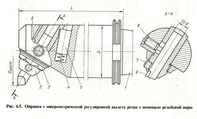 Одной из простых и надежных конструкций расточного инструмента является конструкция оправки с микрометрической регулировкой вылета резца. Конструкция состоит из корпуса 1 с конусом 7/24 по ГОСТ 25827-83. В корпусе на переднем торце имеется наклонное (под углом 530) точно выполненное отверстие, в котором расположена державка 2 с квадратным сквозным отверстием для резца 9. На державке образована точная резьба, на которую навинчена лимб-гайка 3 со шкалой. Державка от проворота снабжена шпонкой 6, которая скользит по шпоночному пазу, имеющемуся в отверстии корпуса 1. Пружина 4 и толкатель 5 осуществляет постоянный прижим лимбгайки 3 к плоскости корпуса 1. Резец 9 предварительно устанавливается в пазу державки 2 и закрепляется винтом 7, соединяющим жестко резец с державкой. Регулирование вылета резца осуществляется посредством поворота лимба-гайки на некоторый угол, соответствующий определенному числу делений лимба. Цена одного деления лимба соответствует радиальному перемещению резца на 0,01 мм. Винт 8 служит для фиксирования державки и резца в заданном положении. Предварительная настройка на размер производится вне станка на приборе, а окончательная подналадка - по пробному проходу.