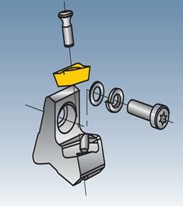 Крепление пластины двумя винтами обеспечивает высокую жесткость крепления, что необходимо при высоких скоростях резания и больших подачах