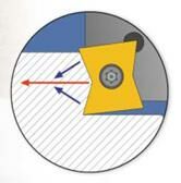 Форма пластины такова, что результирующая сила резания направлена вдоль оси шпинделя. Это обеспечивает высокую жесткость системы и позволяет работать на больших вылетах - снижаются вибрации.