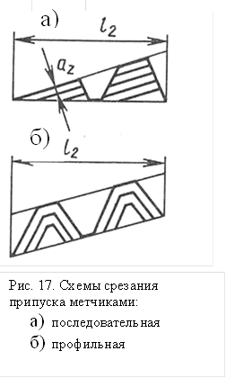 Режущая часть производит основную работу срезания припуска, выполняется в виде конуса с углом наклона образующей φ. Может применяться последовательная (рис.17.а) или профильная (рис.17 б) схемы резания. Длина режущей части l1 (рия.16) влияет на производительность, стойкость инструмента и точность нарезаемой резьбы.