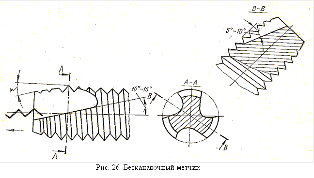 Стружечная канавка не сквозная, а прорезается на длине несколько превышающей длину режущей части под углом наклона к оси 100…150. Направление канавки противоположно направлению нарезки резьбы. Дно канавки располагается под углом к оси метчика 50…100. на калибрующей части выполняется обратная конусность не менее 0,2 мм на 100 мм длины.
