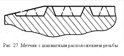 Срезание зубьев метчиков в шахматном порядке(рис. 27) на калибрующей части позволяет снизить силы трения за счет уменьшения поверхности контакта резьбы метчика и нарезаемой детали. Рекомендуются для обработки тонкостенных деталей и при обработке вязких и труднообрабатываемых материалов.