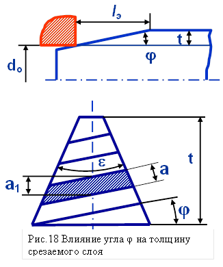 Угол φ влияет на толщину срезаемого слоя (рис.18)