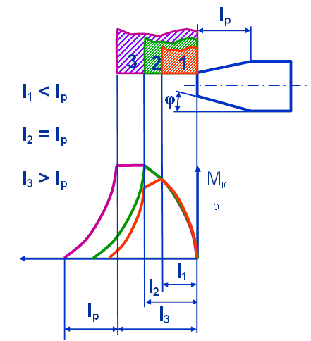 Длина режущей части метчика l1 зависит от его назначения. При обработке глухих отверстий от длины заборной части зависит длина недореза резьбы и ее желательно уменьшать. При обработке сквозных отверстий от соотношения длины режущей части и длины резьбы зависит крутящий момент резания (рис. 19). Для уменьшения крутящего момента желательно, чтобы длина режущей части была больше длины резьбового отверстия.
