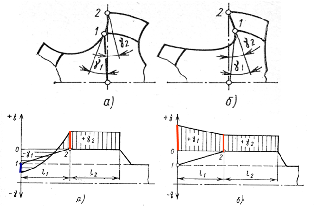 - передний угол изменяется от отрицательных значений в начале режущей части (точка 1) до положительных значений в конце режущей части (точка 2);