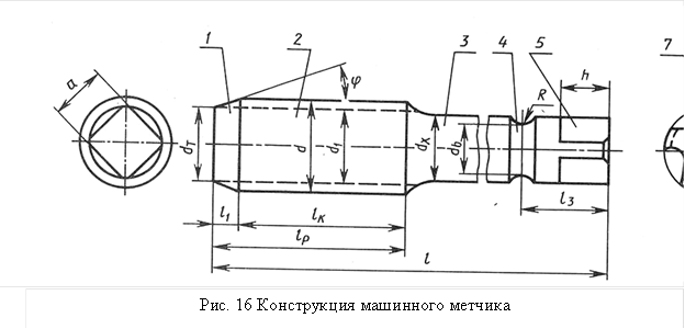Для глухих отверстий и чистовых комплектных метчиков длину режущей части уменьшают до (1,5…2)Р, где Р – шаг резьбы. Гаечные метчики имеют длину (6…12)Р, машинно-ручные -6Р.