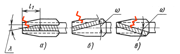 - Винтовые канавки с направлением одноименным направлению нарезки резьбы (рис. 22 в) обеспечивают сход стружки в сторону хвостовика. Применяются при обработке глухих отверстий, но геометрия самая неблагоприятная.