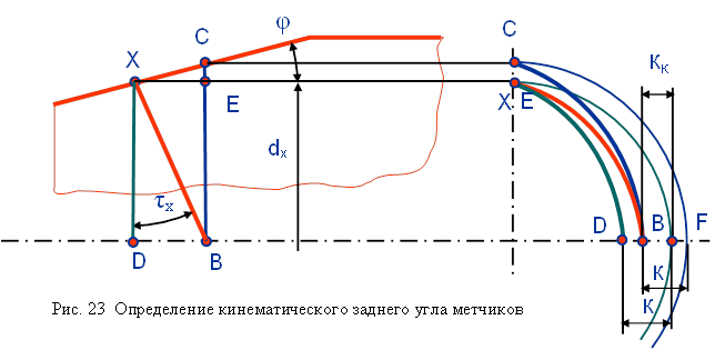 Задний угол на вершине должен обеспечивать боковые задние углы в пределах 15…20΄ . Кинематический задний угол отличается от статического (рис. 23) и определяется по формуле: