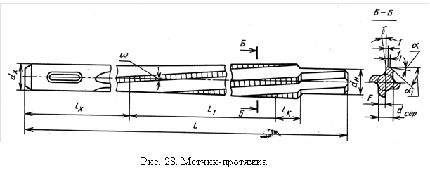 Метчики-протяжки (рис.28) применяются для нарезания резьб крупного профиля, например трапецеидальных, в сквозных отверстиях. Обработка производится за один проход на токарном станке. Метчик-протяжка отличается повышенной прочностью и жесткостью, т.к. в отличие от обычных метчиков работают не на сжатие, а на растяжение. Это позволяет уменьшать толщину срезаемого слоя за счет увеличения длины режущей части.