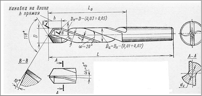 Во избежание прогиба и поломки сверла дно канавки делают с занижением относительно оси на 0,05…0,15 мм. При этом при сверлении в отверстии получается сердечник, обеспечивающий дополнительное направление