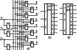 На рис. 3-25, а показан способ построения дешифратора на примере схемы дешифратора для трехразрядного входного слова. Схема представляет собой набор из восьми трехвходовых элементов И, на входы которых поданы все возможные комбинации прямых и инверсных значений разрядов слова.