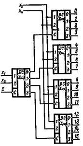 Для получения нужных 16 выходов составляется столбец из четырех дешифраторов второго яруса. Дешифратор первого яруса принимает два старших разряда входного кода Х1 и Х2. Возбужденный единичный выход этого дешифратора отпирает один из дешифраторов столбца по его входу разрешения. Выбранный дешифратор столбца расшифровывает 2 младших разряда входного слова.