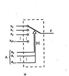 В цифровых устройствах часто возникает задача передачи цифровой информации от т различных устройств через канал общего пользования и обратная задача передачи информации, получаемой из общего канала т различным устройствам. Для этого на входе канала устанавливается устройство, называемое мультиплексором, которое осуществляет подключение одного из входных каналов к выходному под управлением адресного слова Ат, а на выходе канала -устройство демультиплексор , которое передает данные из входного канала к одному из приемников, имеющему цифровой адрес An. Входы мультиплексора и демультиплексора делятся на две группы: информационные и адресные. Работу мультиплексора можно упрощенно представить с помощью многопозиционного ключа. Адресующий код А задает переключателю определенное положение, соединяя с выходом F один из информационных входов хi.