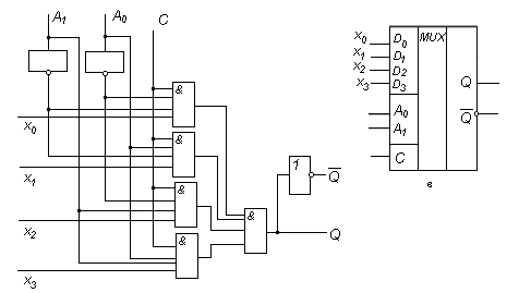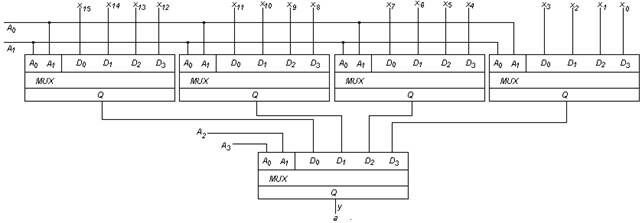 Если выходы мультиплексоров первой ступени подключить ко входам мультиплексора второй ступени, образуется так называемое мультиплексориое дерево. На рис. 5.17,а показана схема , реализующая функцию «16 –1» на 4-х разрядных мультиплексорах. При этом первый ярус схемы представляет собою столбец, содержащий столько мультиплексоров, сколько необходимо для получения нужного числа информационных входов. Все мультиплексоры столбца адресуются одним и тем же кодом, составленным из соответствующего числа младших разрядов общего адресного кода (А0А1). Старшие разряды адресного кода (А2А3) используются во втором ярусе, мультиплексор которого обеспечивает поочередную работу мультиплексоров первого яруса на общий выходной канал.