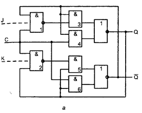 Примером триггера со сложной входной логикой служит JK-триггер с группами входов J1J2J3 и К1К2К3, соединенными операцией конъюнкции: J= J1J2J3 , K= К1К2К3.