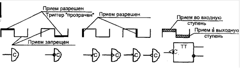 На рис. 3.3 показаны процессы, происходящие в синхронных (тактируемых) триггерах. На диаграммах тактовых импульсов отмечено содержание процессов на отдельных этапах, под диаграммами даны обозначения соответствующих типов синхровходов.