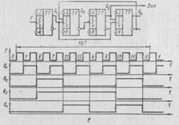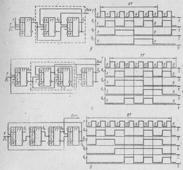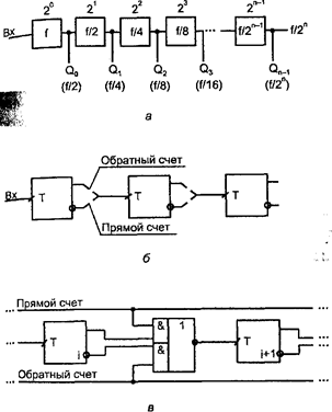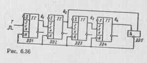 Приведенные на рис. 6.34 схемы последовательных счетчиков предназначены в основном для использования в режиме деления частоты без дешифрации их состояний, смена которых при использовании структуры на рис. 6.35 не соответствует естественному счету. Их достоинство — максимальное быстродействие, ограниченное предельной частотой переключения входного триггера, при минимальных затратах оборудования.