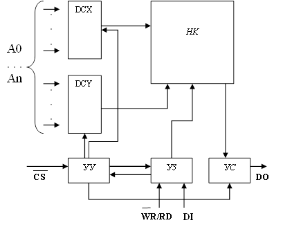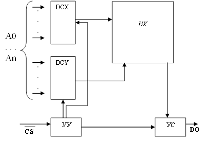 По структуре полупроводниковые ОЗУ, ППЗУ, РПЗУ (рис. 3.3) и ПЗУ (рис.3.4) состоят из следующих типовых узлов: накопителя HK, дешифратора строк и столбцов DСХ, DСУ, устройства записи УЗ; устройства считывания УС; устройства управления УУ.