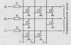 в ПЗУ на основе МДП-структур записывается в ходе технологического процесса изготовления с помощью фотошаблонов или контактных окон. Современные ПЗУ на n-канальных МДП-структурах имеют информационную емкость 1—256 Кбит, я время считывания 80—500 не и совместимы по уровню управляющих сигналов с ИC типа ТТЛ. Принципиальная схема ПЗУ на n-канальных МДП-транзисторах показана на рис. 3.6..