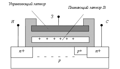 В РПЗУ возможна полная перезапись информации или же частичное селективное изменение хранимой информации в отдельных ЗЭ. РПЗУ на МДП-структурах допускают многократную перезапись и хранение информации при отключении питания. Число перезаписей ячеек вследствие износа запоминающих элементов ограничено. В РПЗУ запоминающие элементы строят на базе МДП-структур с захватом заряда и с плавающим затвором. ЗЭ с плавающим затвором по сравнению с ЗЭ захвата заряда более просты в изготовлении и обеспечивают длительное сохранение информации. Рассмотрим их в качестве примера.