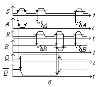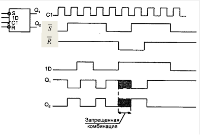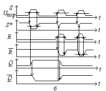 На временных диаграммах символом (*) помечены интервалы воздействия на входы RS-триггеров запрещенных комбинаций информационных сигналов. При этом в триггере на элементах ИЛИ—НЕ устанавливаются выходные уровни Q = 0,