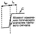 С синхронизацией (тактированием) триггера связаны два важных параметра — время предустановки tSU (Set-Up Time) и время выдержки tH (Hold Time). Важность этих параметров обуславливается еще и тем, что они свойственны не только триггерам, но и другим устройствам. Время tSU — это интервал до поступления разрешающего фронта синхросигнала, в течение которого информационный сигнал должен оставаться неизменным (рис. 3.4). Для триггеров с динамическим управлением— это время необходимое для надежного переключения нижней ступени двухступенчатого триггера. Для триггеров, управляемых уровнем синхросигнала, в которых предусматривается однократное переключение триггера в соответствии с уровнем информационного сигнала, tSU так же необходимо для установления правильных значений сигналов в элементах управляющей схемы перед подачей их на элементы фиксатора. Время выдержки tH — это время после поступления разрешающего фронта синхросигнала, в течение которого информационный сигнал должен оставаться неизменным. Для триггеров с динамическим управлением — это время необходимое для перехода нижней ступени в режим хранения и блокирования информационных входов. Для триггеров, управляемых уровнем синхросигнала в режиме однократной записи входной информации за время действия разрешающего уровня синхросигнала, значение информационного сигнала не должно меняться на протяжении всего временного интервала, пока запись в триггер разрешена. Когда допустим прозрачный режим работы триггера (многократное его переключение как реакция на многократное изменение информационного сигнала на интервале разрешения), тогда понятия tSU и tH для триггеров, управляемых уровнем синхросигнала, теряет смысл.